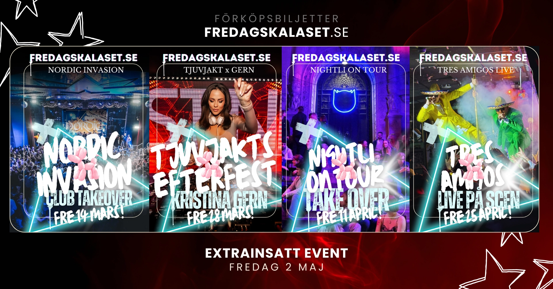 Fredagskalaset är tillbaka! Från de legendariska kvällarna på Hipp hösten 2016 är vi nu redo att göra dina fredagar magiska igen! Under våren 2025 bjuder vi in till utvalda fredagar fyllda med grymma artister, spektakulära shower och temafester du sent kommer glömma. Tryck på bilden för att komma till nästa event! Missa inte att följa oss på Instagram för sneak peeks och uppdateringar: @fredagskalaset.se